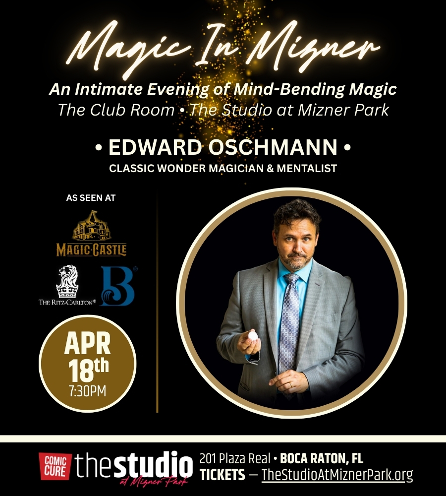 The Studio & Comic Cure proudly present:MAGIC IN MIZNER PARK — Edward OstermannSaturday, April 18th — 7:30 PMIN THE CLUB ROOM! Edward Oschmann is an award-winning close-up, magician and mentalist. He has performed and lectured at the World Famous Magic Castle in Hollywood California. He was also a featured performer at Malone’s Magic Bar, at […] ...