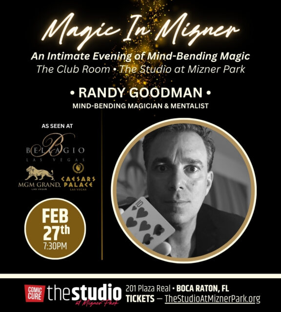The Studio & Comic Cure proudly present:MAGIC IN MIZNER PARK — Randy GoodmanFriday, February 27th — 7:30 PMIN THE CLUB ROOM! Get ready for an evening where reality bends and nothing is quite what it seems with master magician and mentalist Randy Goodman. This interactive show combines mind reading, psychological illusion, and impossible feats performed […] ...