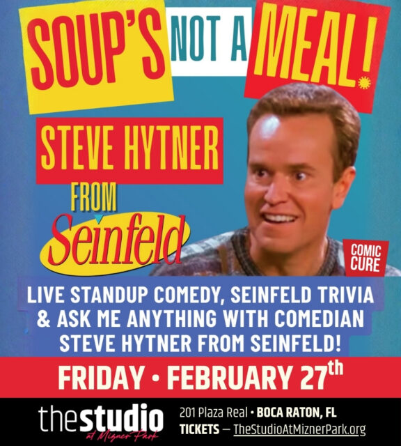 The Studio & Comic Cure proudly present:STEVE HYTNER Friday, February 27th — 7:30 PMSOUP’S NOT A MEAL! Get ready for a night of laughter and fun as Comic Cure presents “Soup’s not a meal!” Comedy Night withSteve Hytner from Seinfeld! Join one of America’s best stand up comedians and most recognized character actors for a […] ...